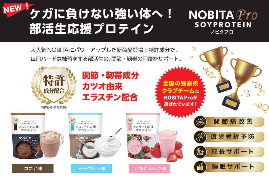 NOBITA PROはNOBITAの成分が全て入っています。NOBITA PROには関節のケガに特化したエラスチンが入っています。1週間に4日以上運動している方向けに適しています。